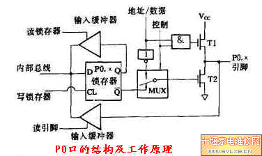 总线I/O端口,双向,三态,http://www.sylxb.cn/download/EPROMshuju/' target='_blank' class='infotextkey'>数据地址分时复用,该端口除用于http://www.sylxb.cn/download/EPROMshuju/' target='_blank' class='infotextkey'>数据的输入/输出外,在8031单片机外接程序存储器时,还分时地输出/输入地址/指令。由Po端口输出的信号无锁存,输入的信息有读端口引脚和读端口锁存器之分。P0端口8位中的一位结构图见下图: