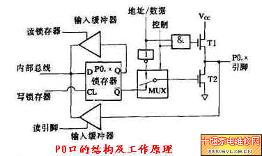 总线I/O端口,双向,三态,http://www.sylxb.cn/download/EPROMshuju/' target='_blank' class='infotextkey'>数据地址分时复用,该端口除用于http://www.sylxb.cn/download/EPROMshuju/' target='_blank' class='infotextkey'>数据的输入/输出外,在8031单片机外接程序存储器时,还分时地输出/输入地址/指令。由Po端口输出的信号无锁存,输入的信息有读端口引脚和读端口锁存器之分。P0端口8位中的一位结构图见下图:
