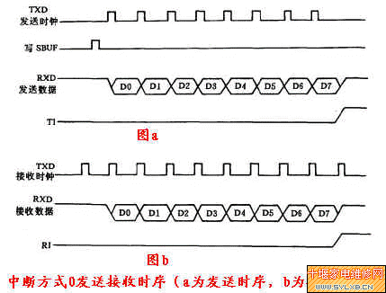 2.串行端口的工作方式 ①方式0 8位移位寄存器输入/输出方式。多用于外接移位寄存器以扩展I/O端口。波特率固定为fosc/12。其中,fosc为时钟频率。 在方式0中,串行端口作为输出时,只要向串行缓冲器SBUF写入一字节http://www.sylxb.cn/download/EPROMshuju/' target='_blank' class='infotextkey'>数据后,串行端口就把此8位http://www.sylxb.cn/download/EPROMshuju/' target='_blank' class='infotextkey'>数据以等的波特率,从RXD引脚逐位输出(从低位到高位);此时,TXD输出频率为fosc/12的同步移位脉冲。http://www.sylxb.cn/download/EPROMshuju/' target='_blank' class='infotextkey'>数据发送前,仅管不使用中断,中断标志TI还必须清零,8位http://www.sylxb.cn/download/EPROMshuju/' target='_blank' class='infotextkey'>数据发送完后,TI自动置1。如要再发送,必须用软件将TI清零。 串行端口作为输入时,RXD为http://www.sylxb.cn/download/EPROMshuju/' target='_blank' class='infotextkey'>数据输入端,TXD仍为同步信号输出端,输出频率为fosc/12的同步移位脉冲,使外部http://www.sylxb.cn/download/EPROMshuju/' target='_blank' class='infotextkey'>数据逐位移入RxD。当接收到8位http://www.sylxb.cn/download/EPROMshuju/' target='_blank' class='infotextkey'>数据(一帧)后,中断标志RI自动置。如果再接收,必须用软件先将RI清零。 串行方式0发送和接收的时序过程见下图。 ②方式1