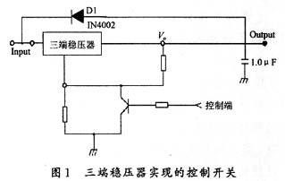三端稳压器是设计者十分熟悉的常用廉价器件。图1是利用三端稳压器设计的开关电路。从控制端加入的信号决定是否将三端稳压器与地导通。若导通则输出端上电,否则输出端相当于断开。此电路十分简单,也容易调试,且有多种电压的稳压器供选用,适用于直流负载的控制。缺点是稳压器的管压降使输出电压有所降低,不适合电池供电的设备。选用低压差三端稳压器会有所改善。