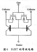基于MOS场效应管的无触点开关器件很多,例如日本电气公司(NEC)的 PS7200系列、Toshi ba TLP351系列、松下Nais AQV系列。通常低导通电阻型适用于负载电流较大的场合,例如N EC PS710B1A:导通电阻Ron = 0.1Ω( 大),负载电流IL=2.5 A( 大),导通时间Ton=5 ms。低CR积型的光MOS FET适用于需要切换高速信号的场合,如测量仪表的测试端等。所谓CR积指的是输出级MOS FET的输出电容与接通电阻的乘积,他是评价MOS FET特性的一个参数指标。如NECPS7200H1A:导通电阻Ron=2.2 Ω,CR积为9.2 pF·Ω,导通时间Ton=0.5 ms,负载电流IL =160 mA。绝缘栅双极晶体管IGBT[3]的结构如图6所示。
