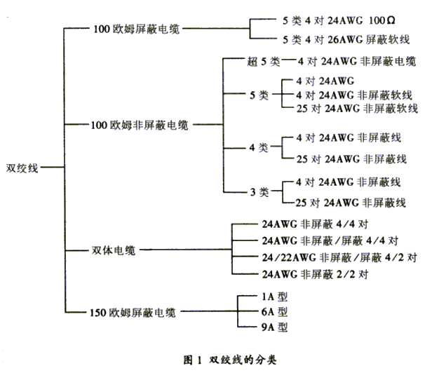 双绞线分为屏蔽双绞线与非屏蔽双绞线两大类。在这两大类中又分100欧姆电缆、双体电缆、大对数电缆、150欧姆屏蔽电缆。 具体型号有多种,如图1所示。图中AWG表示美国线缆规格。 |  javascript:window.open(this.src);" style="cursor: pointer;"/> | | 三、性能指标 对于双绞线,用户 关心的是表征其性能的几个指标。这些指标**括衰减、近端串扰、阻抗特性、分布电容、直流电阻等。 (1)衰减 衰减(Attenuation)是沿链路的信号损失度量。衰减与线缆的长度有关系,随着长度的增加,信号衰减也随之增加。衰减用"db"作单位, 表示源传送端信号到接收端信号强度的比率。由于衰减随频率而变化,因此,应测量在应用范围内的全部频率上的衰减。