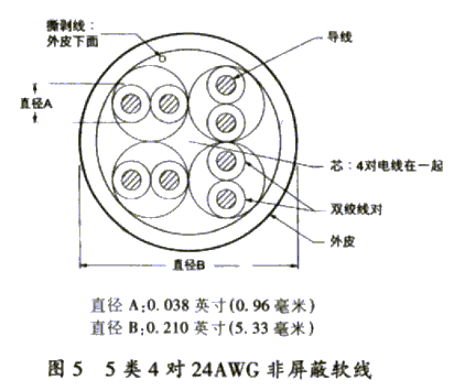 | 图3 5类4对24AWG非屏蔽电线电气特性  javascript:window.open(this.src);" style="cursor: pointer;"/> | | 4. 5类4对24AWG非屏蔽软线 它由4对线组成,用于高速数据传输,适合于扩展传输距离,应用于互连或跳接线。传输速率达100MHz。 导线组成如表9所示,它的物理结构如图5所示, 电气特性如表10所示。 |