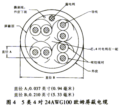 | 3、5类4对26AWG屏蔽软线 它由4对线和一根26AWG TPC漏电线组成,传输频率达100MHz。导线组成如表8所示,物理结构如图4所示,电气特性如表9所示。 | 表8 导线色彩编码