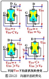 在图Z0123所示电路中,UGS <0,两个PN结处于反向偏置,耗尽层有一定宽度,ID=0。若|UGS| 增大,耗尽层变宽,沟道被压缩,截面积减小,沟道电阻增大;若|UGS| 减小,耗尽层变窄,沟道变宽,电阻减小。这表明UGS控制着漏源之间的导电沟道。当UGS负值增加到某一数值VP时,两边耗尽层合拢,整个沟道被耗尽层完全夹断。(VP称为夹断电压)此时,漏源之间的电阻趋于无穷大。管子处于截止状态,ID=0。