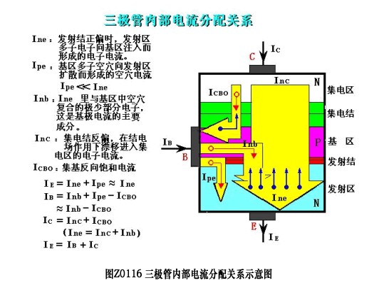 由于发射结外加正向电压,发射区的电子载流子源源不断地注入基区,基区的多数载流子空穴,也要注入发射区。如图Z0116所示,二者共同形成发射极电流IE。但是,由于基区掺杂浓度比发射区小2~2-3数量级,注入发射区的空穴流与注入基区的电子流相比,可略去。