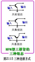三极管在电路中的连接方式有三种:①共基极接法;②共发射极接法,③共集电极接法。如图Z0115所示。