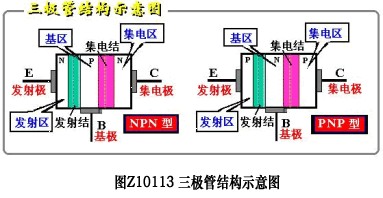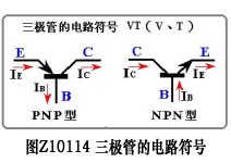 图Z0113和图Z0114 给出了NPN和PNP型两类三极管的结构示意图和表示符号。它有两个PN结(分别称为发射结和集电结),三个区(分别称为发射区、基区和集电区),从三个区域引出三个电极(分别称为发射极e、基极b和集电极c)。发射极的箭头方向代表发射结正向导通时的电流的实际流向。