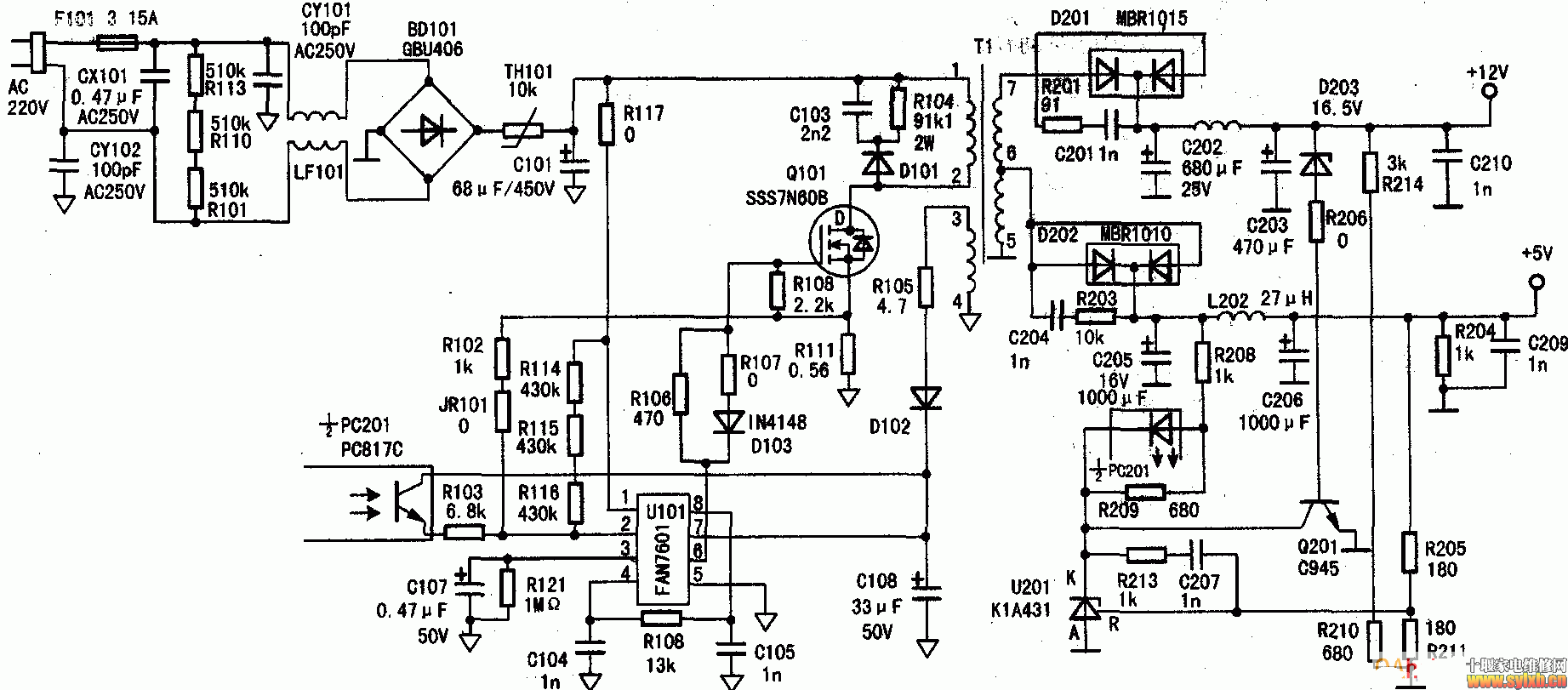 220V交流市电通过交流保险管F101后进入由CXl01、LFl01等组成的抗干扰电路,经抗干扰电路处理后再进入BDl01进行整流。为了防止瞬间大电流冲击,在整流后加入了THl01 NTC热敏电阻, 后经C101滤波生成约300V的直流电压。 从中可以看出,本电路不同于其他显示器开关电源的地方,一是THl01的位置不同(一般电路多设置在电源进线端),另一点就是未设置电源开关,从而决定了只要插头接人市电,整个开关电源电路就开始工作,这也恰恰是借助于FAN7601优良的“绿色”功能来实现的。 整流滤波电路产生的约300V直流电压分两路输入开关电源电路,一路经开关变压器T1的①一②绕组加到开关管Q101的漏极。 另一路通过启动电阻R117加到开关电源PWM控制器FAN7601的①脚,通过启动控制电路由⑦脚对外部电容c108充电,当C108两端电压上升到11V时,FAN7601内部振荡电路起振,从⑥脚输出驱动脉冲,通过D103、R106、R107加到Q101栅极,使开关管工作于开关状态。开关变压器各绕组有感应电压产生,通过各整流滤波系统向负载提供直流电压。其中开关变压器的③-④绕组产生感应电压经R105限流、I)102滤波后向FAN7601的⑦脚提供芯片工作电压,启动控制电路关断①脚的电流输入。 在以往的开关电源 维修中,尽管采用启动电阻功率比较大但依然是易损元件之一,而且发热量也比较大,实际上就是由于通电后启动电阻一直有电流通过的原因。而在这款电源中,启动电阻却采用了一个0Ω的贴片元件,是明显区别于其他电路的,这里我们学习到新型“绿色电源芯片”内部都设有一个启动开关,一旦电源达到正常工作状况(启动过程结束),就会切断启动电阻器,这样便可省去一大部分的功率损耗。其电路本身的故障率也接近于零。 该机稳压控制电路主要由U101、光电耦合器PC201、精密稳压器件U201(KIA431)及取样电阻R205、R211、R214、R210等组成。当开关变压器次级+12V或+5V输出电压升高时,经取样电阻分压加至U201的R端电位升高,L5201的K端电压则降低,使流经光电耦合器PC201内部光敏二极管的电流增大,其发光管亮度增强,光敏三极管导通程度增强, 终使流入U101的②脚电流增加,其内部振荡电路降低输出驱动脉冲占空比,使开关管Q101的导通时间缩短,输出电压降低。如果输出电压降低则TC输出驱动脉冲占空比升高,这样使输出电压保持稳定。