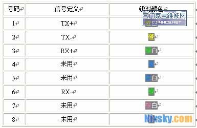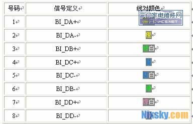 1->橙白 2->橙 3->绿白 4->蓝 5->蓝白 6->绿 7->棕白 8->棕 而且,使用电缆两头一对一的连接方式, 会使一组信号(负电压信号)通过不绞合在一起的两根芯线传输,造成极大的近端串扰(NEXT-> Near-end-crosstalk)所以应按照国际标准打线!!