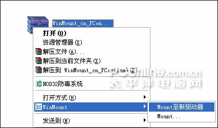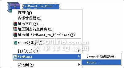 图1 用右键菜单将“WinMount_cn_PConline.zip”Mount至新驱动器