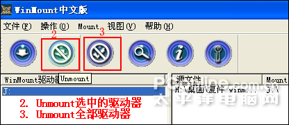 Winmount 创建之新盘符及文件目录当然Mount了之后,当然就还有一个Unmount之过程,也就是取消虚拟磁盘。如图6,选中J盘,然后单击第二个按钮就可以 Unmount了,此时通过Winmount建立之虚拟磁盘就被取消了。当然用户可以直接单击第三个按钮就能够Unmount所有之Winmount驱动 器了。
