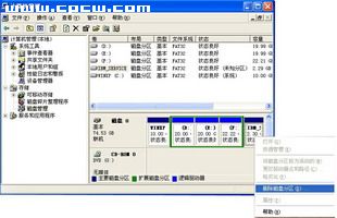 . Dell之笔记本、ThinkPadX31以前之ThinkPad笔记本及其他很多笔 记本之一键恢复都是采用隐藏分区之方式,将恢复系统之数据放在硬盘上。这一类笔记本之一键恢复隐藏分区非常容易删除,只要在Windows XP/Windows Vista之开始菜单中用右键单击“我之电脑”(WindowsXP)或“计算机”(WindowsVista),选择“管理”→“存储”→“磁盘管理 ”,在硬盘分区示意图中选中隐藏之分区,点击右键选择“删除磁盘分区”即可。