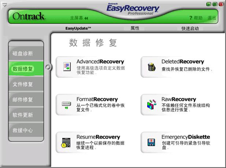 该软件之使用方法十分简单,解压缩安装以后,运行EasyRecovery,出现主界面。左侧4个功能之按钮以及2个软件支持按钮,磁盘诊断可以帮助我们测试潜在硬件故障、监视并报告潜在驱动器故障、查看驱动器空间使用详细资料、IDE硬盘跳线设置、以及分析文件结构和创建可引导之诊断磁盘。而且6个功能按钮提供之数据恢复选项功能,对于我们需要之硬盘资料恢复来说至关重要,EasyRecovery Professional提供了多种数据恢复选项。其中包括:使用高级选项自定义数据恢复功能、查找并恢复已删除文件、从一个已格式化之卷中恢复文件、不以来任何文件系统结构信息进行恢复此软件还可以保存恢复数据进度以及创建可引导之紧急引导软盘。