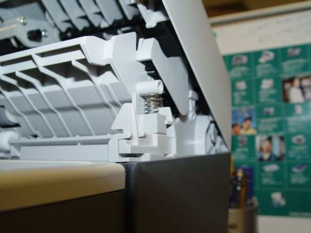 2.此时ADF外层上盖尚无法完全打开,需要向外撬一下位于ADF后部的小塑料卡扣(下图所示用力方向),同时向外侧稍用力掀开: