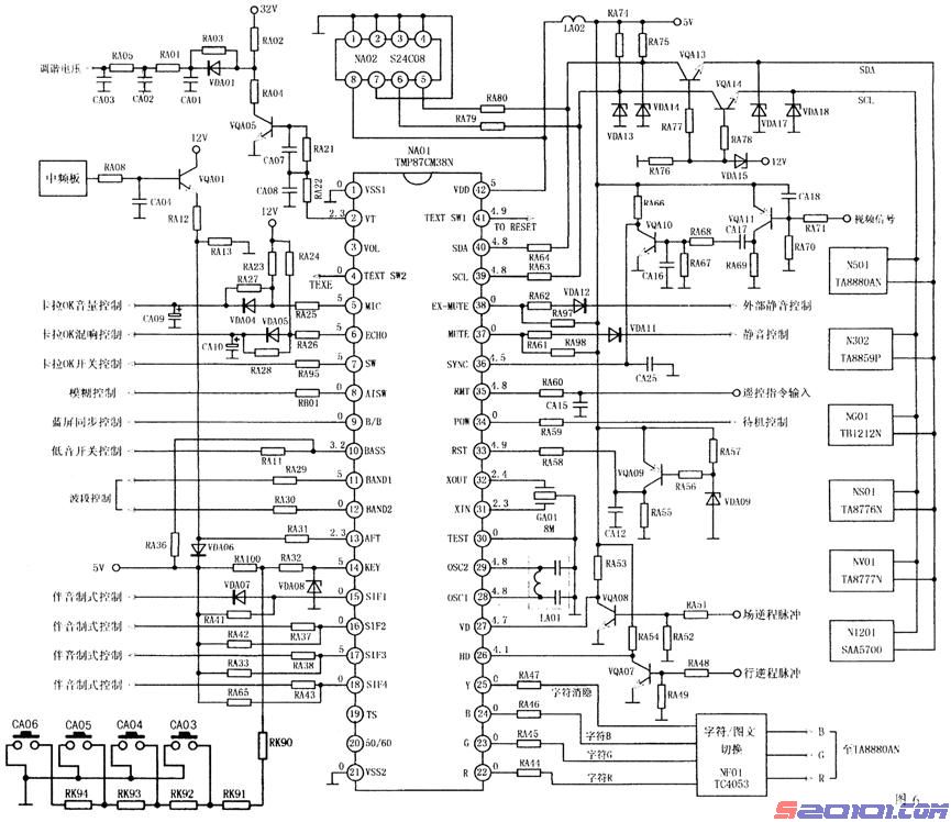 其余引脚的控制功能及外围电路与 TCL-2901 系列彩电遥控系统的对应电路相同,故不 再重述。只不过在http://www.haojdwx.cn/Html/guochan/Class223/223_Index.html'>海信 H97B 机心中,三基色字符信号及字符消隐信号要先送到 NF01,与 图文三基色信号进行切换后再送到小信号处理器 TA8880AN。