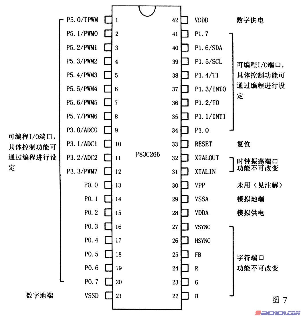 用 42 脚双列封装形式,如图 7 所示。其 I/O 端口的具体控制功能可由厂家编程进行设定。