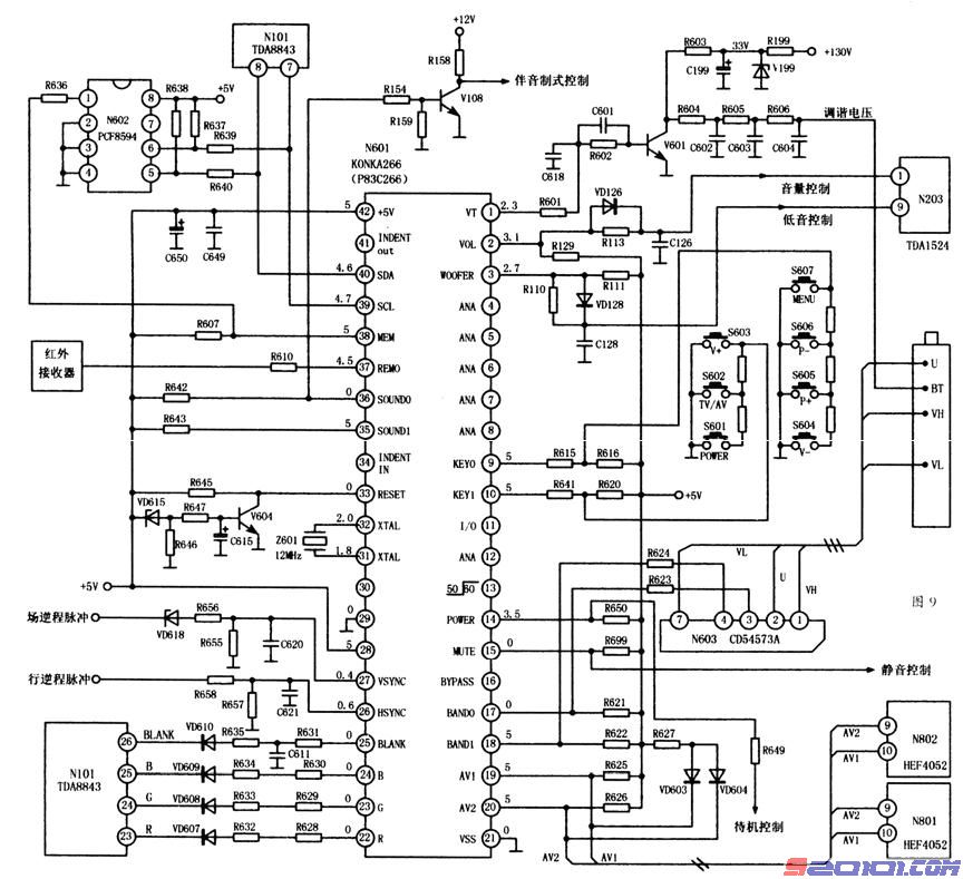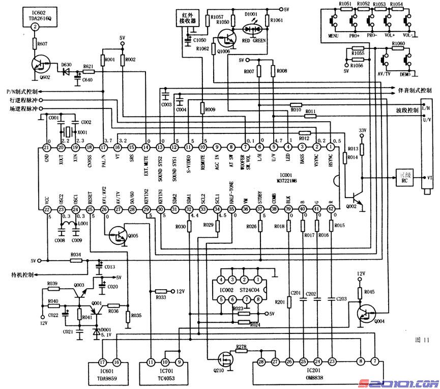 器 TDA9859,还可对梳状滤波器及 TV/AV 切换电路进行控制。下面以 TCL-2975D 彩电