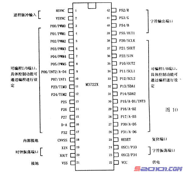 M3722×系列芯片是日本三菱公司推出的单片 8 位 CMOS 微处理器。所包含的主要型 号有 M37220M3、M37221M6、M37225 等,均采用 42 脚封装,如图 10 所示。这类微处理 器内含一个 8 位微控制单元、14 个中断源、4 个 8 位定时器、27 个可编程 I/O 端口、时钟 发生器及字符发生器等电路,同时还设有一定容量的 ROM 及 RAM(容量随型号而异)。这类 微处理器均属可编程器件,只要向其内部 ROM 中写入不同的控制软件,就可对 I/0 端口 的具体控制功能进行定义。