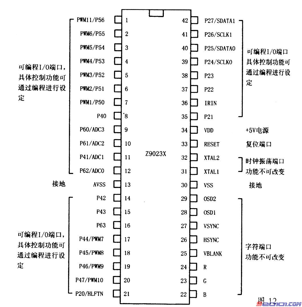Z9023×系列芯片采用双列 42 脚封装形式,如图 12 所示,属可编程 CPU,只需向内部 ROM 中写入不同的控制软件,就可对芯片某些引脚的具体控制功能进行定义,使芯片具有 不同的控制能力。