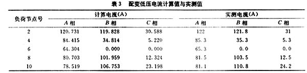 由表3可以看出三相潮流计算结果与实际测量值比较接近。电流的计算值与实测值 大偏差为3.62%, 小偏差为1.04%,平均偏差为3.28%。此偏差程度可以由状态估计得到校正。