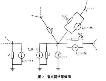以下通过一节点网络的变换模拟过程简单介绍EMTP基本原理。图1为节点1附近的网络详图,假定前一时刻的电流、电压为已知,要求现在时刻的电流和电压。在任何时刻,从节点1经各支路流出的电流必须等于注入的电流i1。