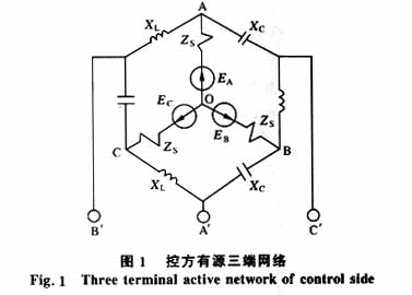 图1中,A、B、C是一个三相电源的三个端点,这个三相电源是控方电网的等值电源。该三相电源的外围,按一定规则连接着三个电感元件和三个电容元件,它们构成相间功率控制器IPC的主体。三相电源和相间功率控制器形成一个出端为A′、B′、C′的控方有源三端网络。其中