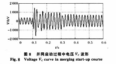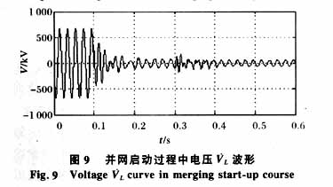 综合考虑端口电压、电容器和电抗器两端电压,当电抗器值为0.408 6H,电容器 值为4.4823E-5F时,VA′O为373.199 2kV,VC为262.258 7kV、VL为474.0551kV, 大电压VC仅为正常运行时EA的1.0939倍,远小于发生串联谐振时的3.99倍。并网启动效果比较理想,避开了串联谐振点。仿真结果如图7、8、9所示。