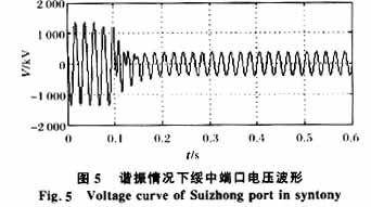 图7、8、9中,在tS为0.1s时东北、华北电网通过联络线并网,在tS为0.3s时切除部分电容器以满足联络线传送功率要求。可以看出,在并网运行和电容器投切时刻,在端口和电抗器、电容器两端存在瞬间过电压,该暂态过程可以通过将电容投切时间选择在电源电压与电容器预先充电电压相等的时刻,控制电力电子开关元件开通时间和次序等电力电子控制技术进行抑制。