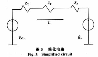含相间功率控制器的控方有源三端网络,当其三相等值电动势和各相等值阻抗得出以后,可以通过联络线将该有源三端网络与对侧系统的等值三相电源联接起来,形成简化电路,假设三相电路对称,可得单相等值电路如图3所示。