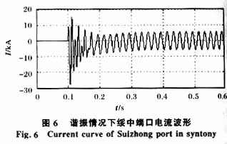 根据上述参数对东北、华北电网接入IPC互联进行了数值仿真。图5、6分别为并网前后东北电网绥中节点端口电压波形和电流波形,在tS为0.1s时,东北、华北电网通过联络线并网。IPC电抗器和电容器两端电压和电流波形与其相近。显然,在并网前,由于串联谐振,造成端口电压、电流过高,为正常运行的K倍。同时,由于谐振导致电抗器、电容器两端电压过高,对元器件损害较大,不利于长期安全运行。
